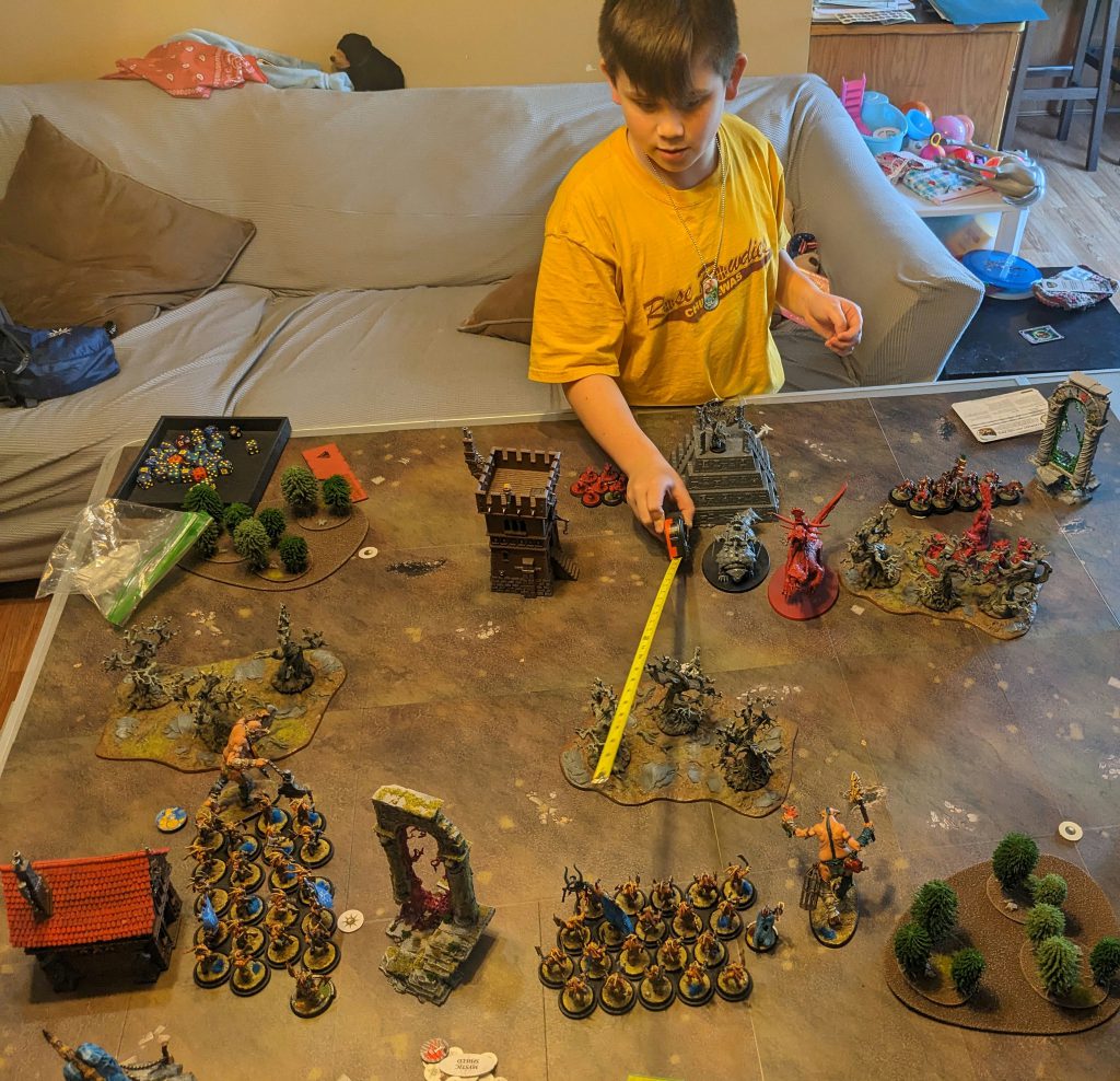 I did manage to wipe out the drones and nurglings, but the blightkings held me up and eventually wiped a unit of gors. We went to time and it was an interesting game - he won but I did learn a bunch. I managed to forget to bring in my ambushers on Turn One which was a mistake that cost me. I got double turned, I believe, which was tough.