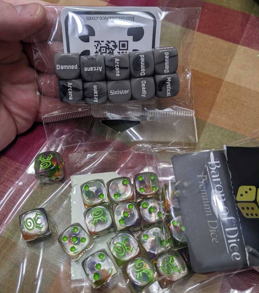 Dice from the Baron Of Dice. I needed some extra scenery dice and I got some Slyvaneth dice for my daughter with flowers in the middle, she loves them. Credit: Michael O "Mugginns"