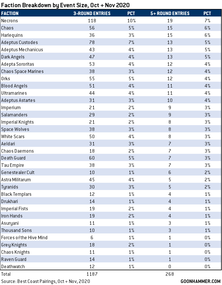 The key takeaways here are that you’re significantly more likely to play against Necrons, Death Guard, and Custodes at a smaller event, and significantly more likely to play against Harlequins at a larger event with tougher competition.