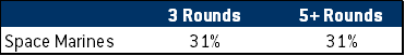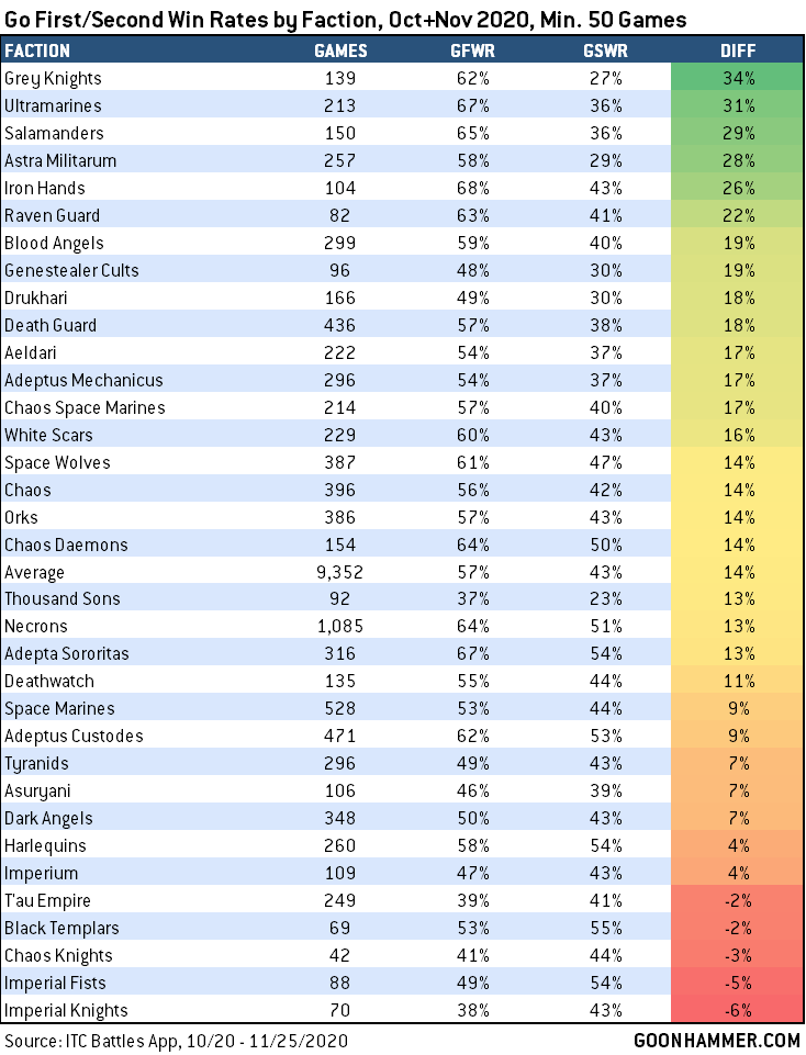 These rates haven’t changed that much from last time, but now we have the ability to add in a meaningful number of games from the Space Marine Chapters to look at how they fare going first and second. The net result is that our data here suggests that Grey Knights are perhaps the army in the game most dependent on acting first, with a massive 34% gulf between first and second turn. Ultramarines and Salamanders also appear to have high discrepancies that are worth keeping an eye on, though they have substantially higher win rates in both categories.