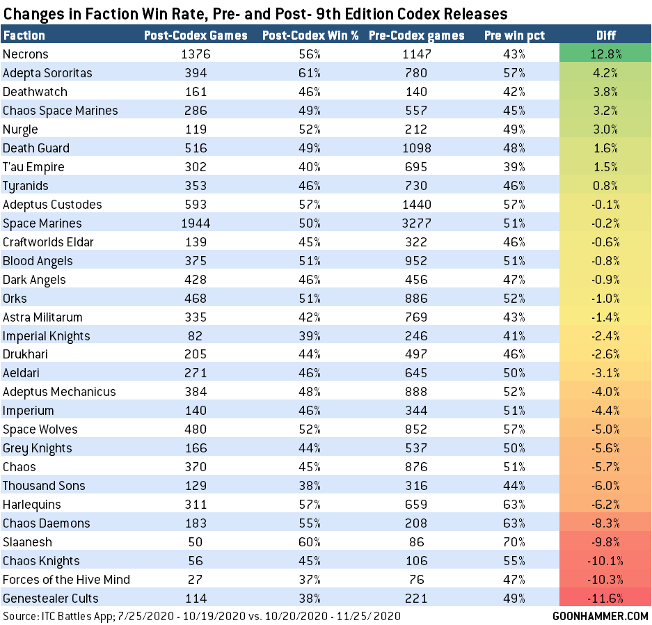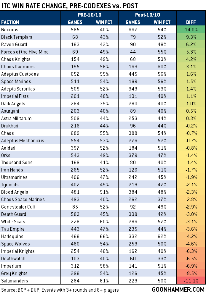 As space marine chapters have been tracked in the ITC as factions for a longer period of time, we can do a comparison to pre- and post-codex win rates that includes them, and from this we can tell the following: