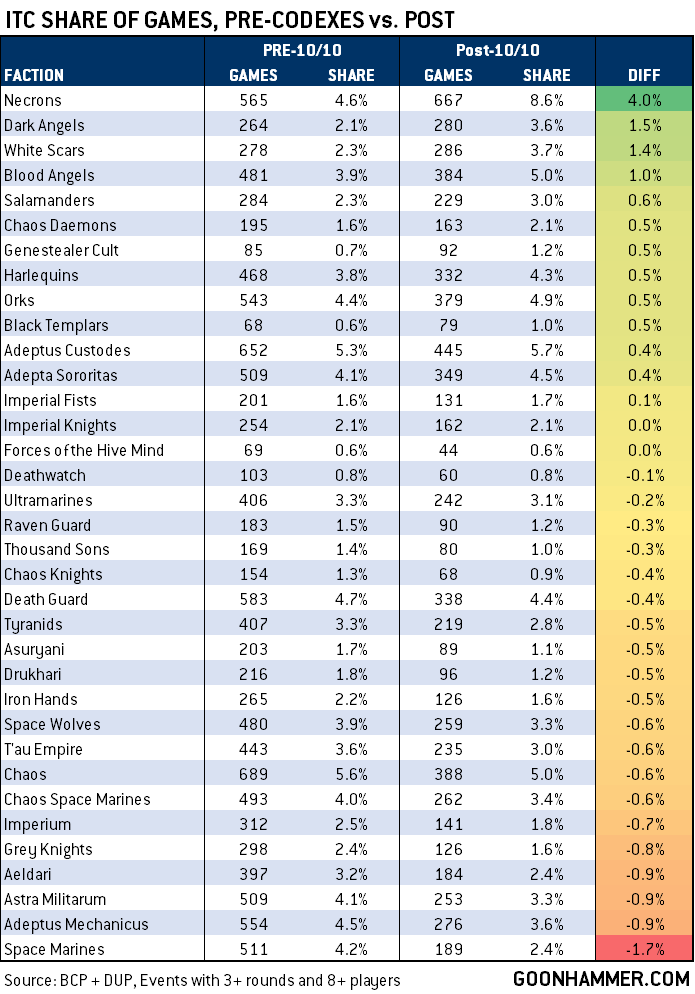 So similar to what we’d previously seen, Necrons got the big boost in games played, and on the Space Marine side, Dark Angels and White Scars have seen minor upticks as generic Space Marine successor chapter use has gone down.