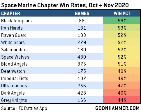 One function that ITC Battles App recently added was subfaction data, allowing us to look at win rates by subfaction. This dataset is pretty small for any faction except space marine chapters, so this month we’ll only be looking at those specific subfactions. In future analyses we may look at Chaos Space Marine legions if we have the chance, and there may be more data on things like Plague Companies.