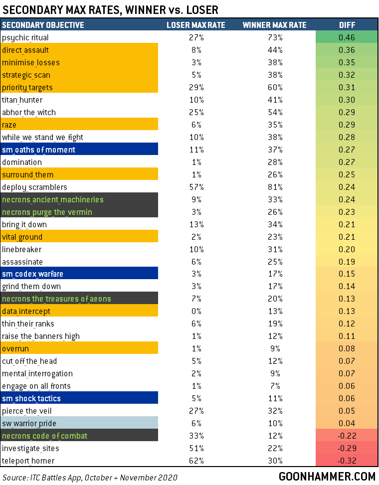 Another big chart but the last one, I promise. Here we have the chances of a player scoring max points for a particular secondary based on whether they won or lost the game. So 73% of winning players who picked Psychic Ritual maxed it out, and only 27% of losing players did. Generally as a philosophy, if a secondary has really high max rates for the winner and poor rates for the loser, it’s “win more,” i.e. maximizing it requires being in a position to win the game already. If it has really high max rates for the loser and really low rates for the winner, it’s probably a bad secondary that encourages you to chase an action that is counter to the act of winning the game otherwise. A secondary need not have equal rates for both to be good.