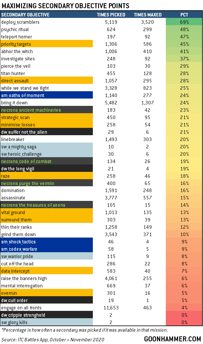 One major impact of the new codexes is the addition of new secondary objectives. While these have been a mix of everything from good (Oaths of Moment) to awful (Cripple Stronghold) to “holy crap what were they thinking” (Suffer Not the Alien), it’s not yet clear what impact they’ve had, and will continue to have, on competitive play. Using data from the ITC Battles App from November and December, we’re able to get a better idea of both how players are selecting and achieving Secondary Objectives, and which ones better contribute to a win.