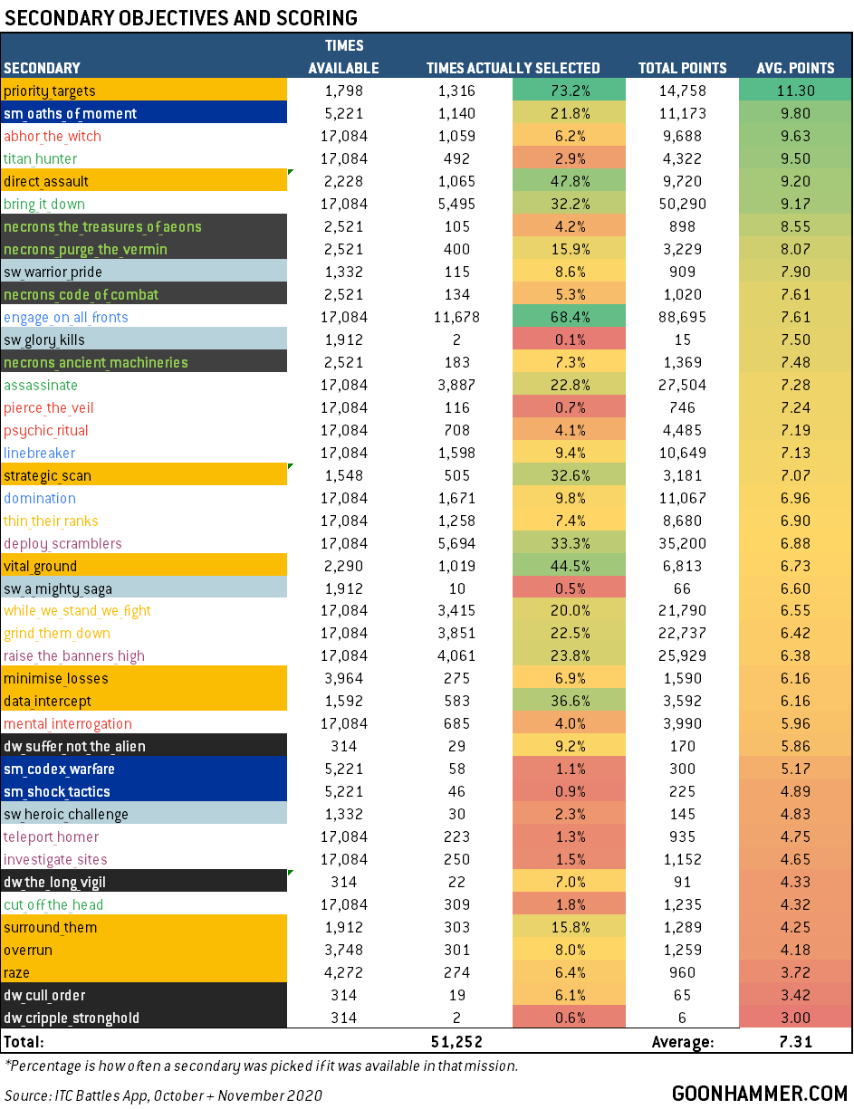 - Priority Targets is pretty much a must-pick. The Secondary for the Priority Target mission, Priority Targets is as close as 9th edition secondaries get to “free real estate.” Players choosing this secondary score an average of 11.3 points off it per game, picking it a whopping 72.3 percent of the time, and it’s on the lower side variance-wise, with a standard deviation of about 4 points. It’s also one of the friendlier secondaries to players in a losing position, and among the top secondaries that a losing player is likely to max (29%). That you’ll always have a “home” Priority Objective marker to score and protect and the fact that scoring occurs at the end of your turn means it can be an easy objective to score even if you’re out of position at the start of the turn.