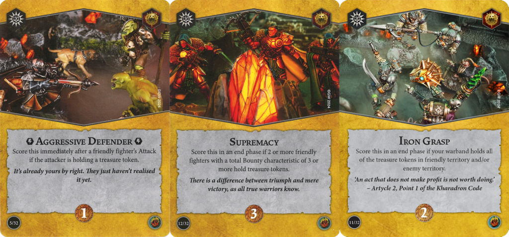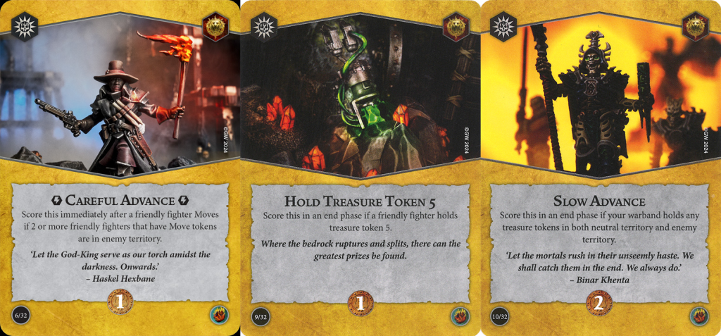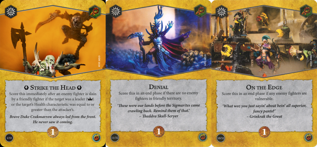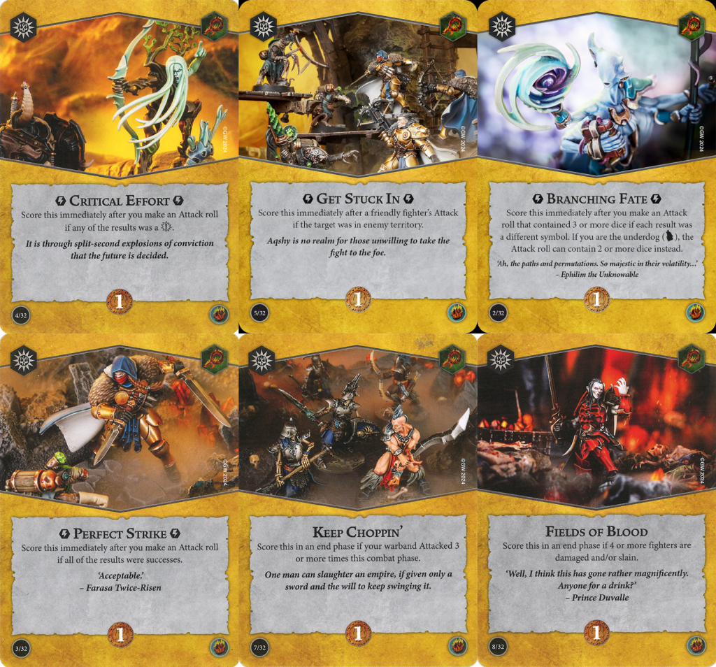 It's not all roses and rainbows because there are some cards that don't quite pull their weight. For objectives, Strike the Head and Strong Start are both what get referred to as "kill surges" which are inherently unreliable. They're not universally panned but you do need to be wary including them because it's a lot harder to kill an enemy on command compared to simply making attacks. Annihilation is also a massive ask because even the most aggressive warband and play is not always guaranteed to wipe the opponent due to dice randomness or playing into tanky opponents, not to mention the awful feeling of seeing it in your opening hand. I guess these three don't exactly meet the criteria of being bad picks, but they are ones that need consideration before choosing.