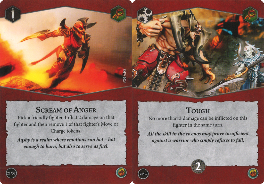 On the power side, the irony of both of these cards being on my list of cards I picked out in the initial review isn't lost on me. Scream of Anger is incredibly niche in use. Not only do you need a warband with fighters that can afford to get domed for 2 damage, but you also need to be in situations where it's useful. They exist, but aren't as common as it seemed to me on first glance. Tough, on the other hand, is just bad. Capping incoming damage is a very potent mechanic, but the threshold of 3 is so high that it's not going to come up in 99% of games. Heck, I did a write-up on