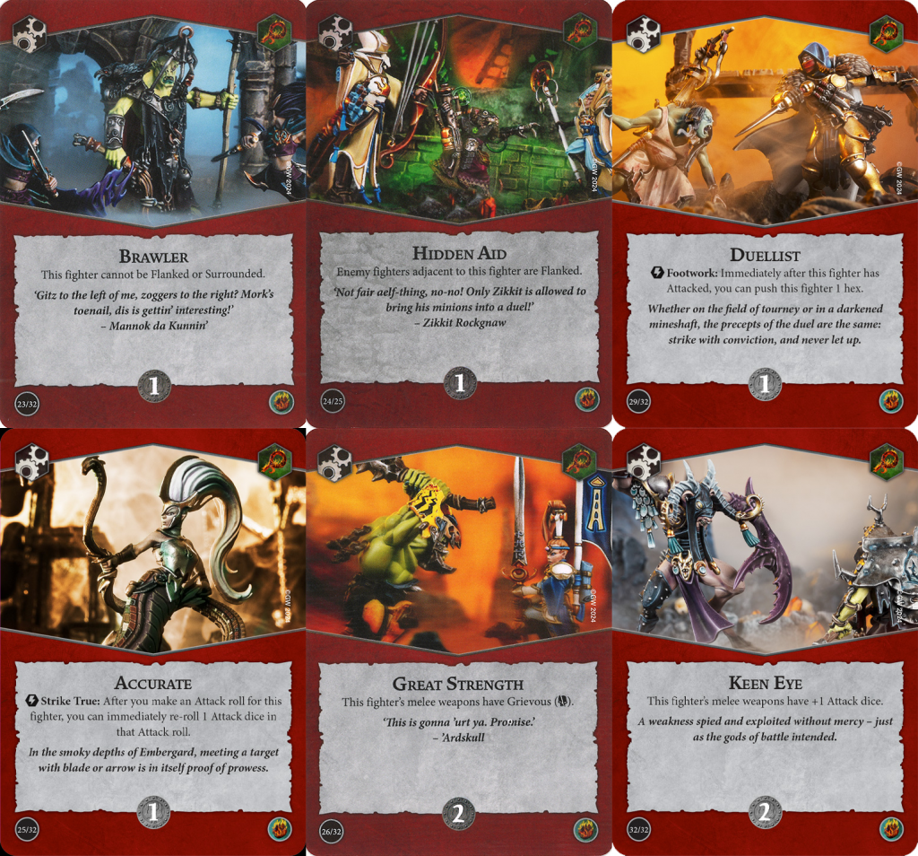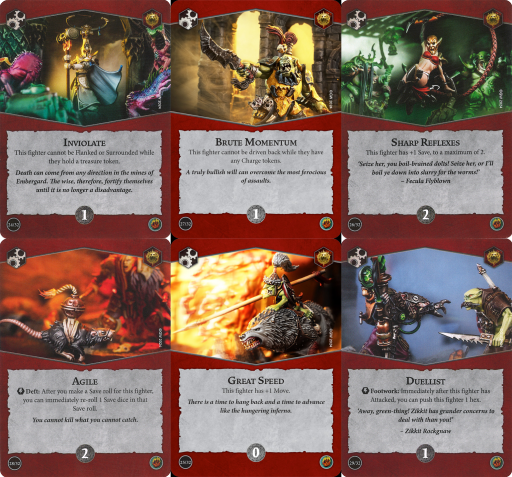 For upgrades, there are some thematically appropriate ways to ensure your fighters can more reliably hold treasure tokens. Inviolate, like Brawler in Blazing Assault, is picking up extra value lately with the introduction of Deadly Synergy. Brute Momentum requires you to want to charge with your fighters, but even the most passive of gameplay styles still usually involves a few charges. Sharp Reflexes and Agile boost fighter save characteristics which is a fairly uncommon effect, so having access to both of them at once is great. Likewise, Great Fortitude is generic but can help push your fighters to a health threshold that requires an additional attack from your opponent. It's not all purely defensive, either. Great Strength and Keen Eye are generic but powerful, and Great Speed functions more like an 11th ploy than an upgrade given its 0 glory cost. Duellist rocks, especially with any attackers who can hit from 2+ hexes away. It can be used to hop onto a treasure token after an attack and even serve as a pseudo-Overrun on demand.