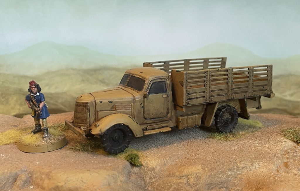 This is a very generic "truck" kit that's almost an Opel Blitz and almost any number of trucks, almost certainly based on a late to post war Soviet and Chinese knock off of American lend-lease. The cast is incredibly cheap vacuum formed plastic, with no pieces, movement or, infact, anything beyond the basic exterior shell. Whatever they are, they look right, scale nicely, and you can buy hundreds for the cost of a much better, nicer, truck kit. Painting this one took all of a minute.