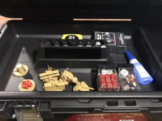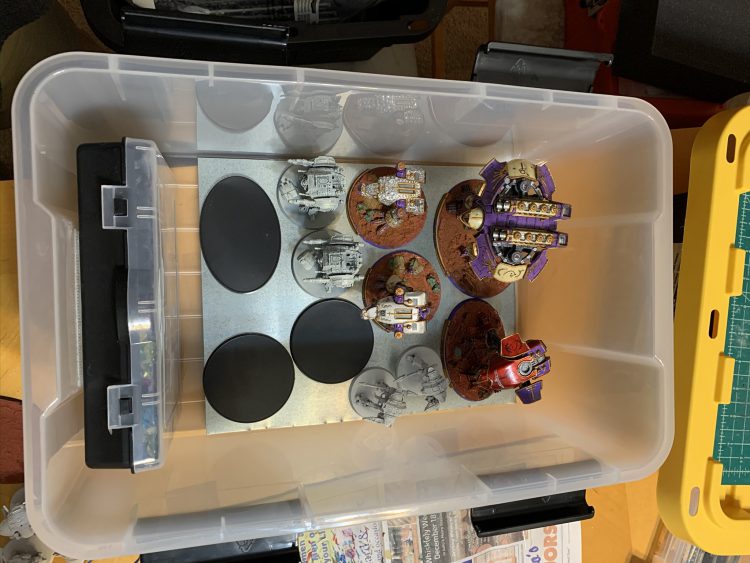 The toolbox needs a flat or fairly flat base inside in order to fix the metal to it securely. It’s also helpful if it has an upper shelf like is shown above. This allows for multiple levels of model storage, plus a place to store dice, rulers, objective markers, etc.