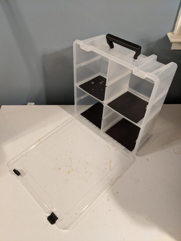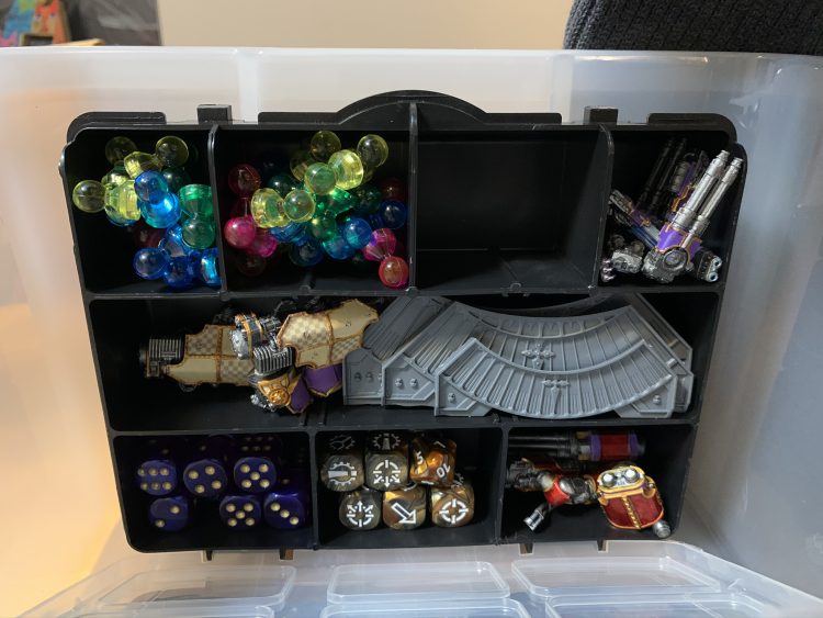 The last step, if I wanted this to be a self-contained transport solution, was a way to hold my dice and all the magnetized weapon loadouts for my Titans. I picked up a small hardware storage box that would suffice and puzzled with how to attach it. Currently, it is attached to one end of the box interior with velcro strips, but I’m having issues with the glue holding the velcro to the side of the larger box (see!) so I’ll likely rip that all out and replace it with magnets at some point.