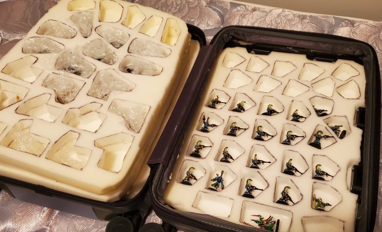 I made them to fly with to various events around the country. That means the requirement was that they’d need to protect my models after being manhandled into checked luggage. For that reason, I chose a hardcover suitcase that wouldn’t easily give to puncture or drops. So I got a large one for large models and vehicles, then a smaller carry-on for infantry, bikes, characters, etc that I can keep close.