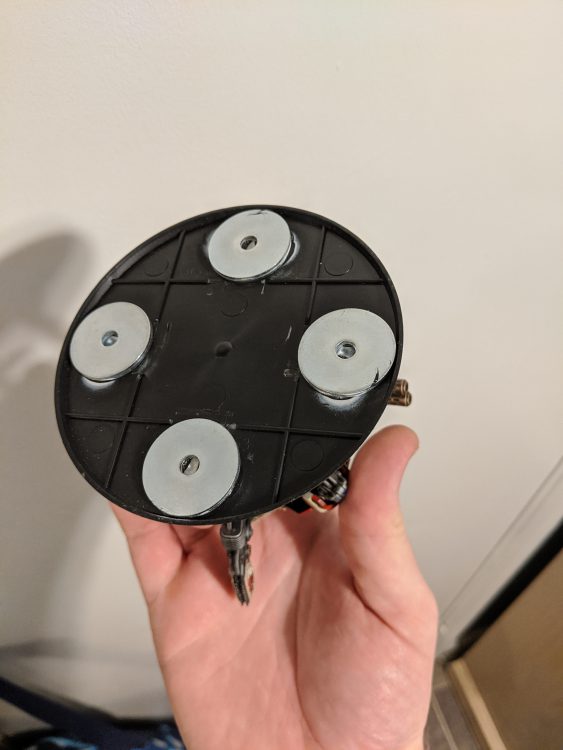 The magnets that you’re looking for should be able to fit under each base. I found neodymium 3/8″ diameter magnets to work well and be surprisingly strong. This shows the scale for reference.