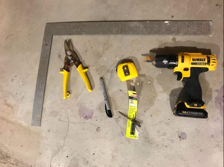 The sheet metal was pretty thin, though I don’t remember the exact thickness. It’s ok if it’s a little flimsy because you’re going to have to be cutting through it, so don’t try to find 1/8″ thick or anything.