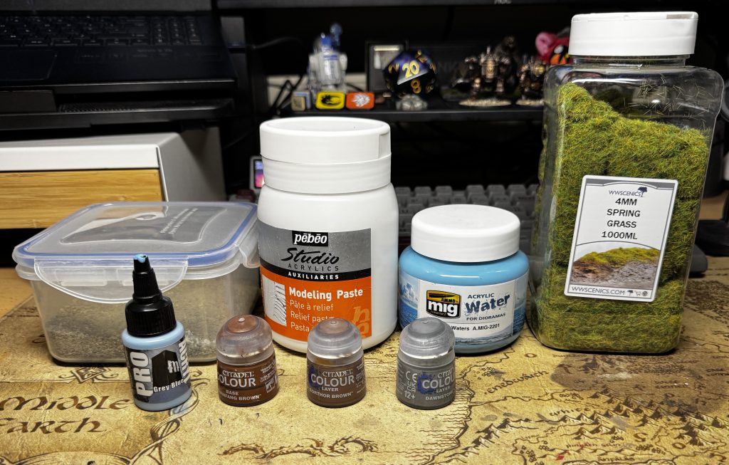 Everything I used to make the board. You'll easily be able to replace any of these with your own favourites, these are just what I had to hand other than the acrylic paste that I picked up on the cheap for this project and used about half of. That tub of sand and rubble is a conglomeration of sand and small rocks that I've accumulated over the years and use as a basing material sometimes; it's not from any particular place but there's plenty of similar mixes you can get.