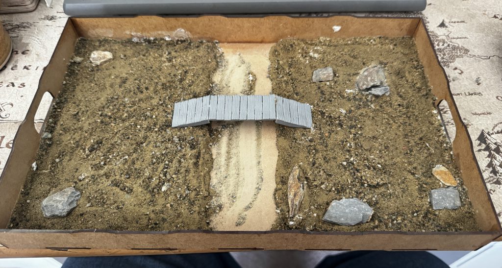 Time to start painting! Start with a heavy drybrush of Mournfang Brown and then a lighter one of Gorthor Brown. I was a bit heavy handed with this making some of that gravel mix come off revealing some of the unsprayed sand below so that just gets covered up later with static grass. After that, drybrush the slate in Dawnstone and pick out some of the larger rocks in the sand mix with it as well, this step is slightly tedious but makes for some really nice detail later on! The bridge got a heavy drybrush with Gorthor Brown and some sort of khaki paint I had to hand that I can't remember, it hardly matters, just make it a lighter brown than the ground.
