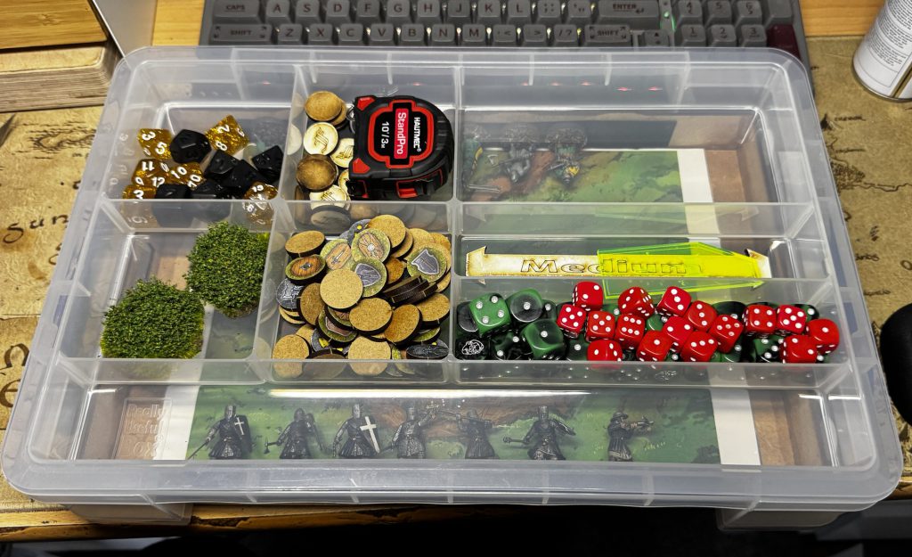 I like using the handgunner as a "crossbow" in game, having an extra model or two per side makes back-to-back games more interesting by having a small amount of variety to choose from for the players. Adding the hobby tray on top for dice, measuring sticks, mini tape measure, and tokens was a very happy accident and it fits very snug together. I threw this into my backpack standing on its short end and everything arrived exactly as I packed it.