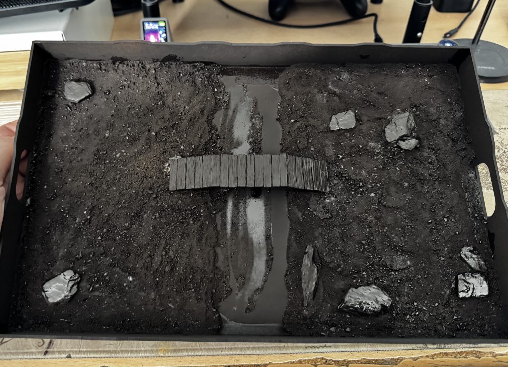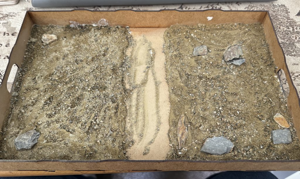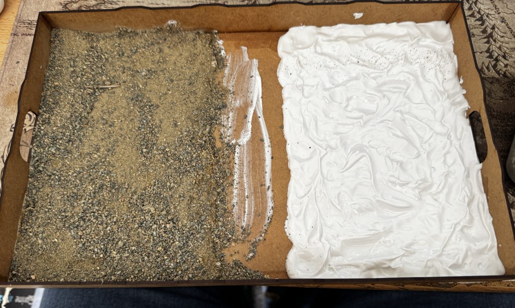 First step was slapping down a nice thick layer of acrylic paste so that the river sits lower than the rest of the board. I just moved it around with an old brush to create varied heights that would look somewhat natural leaving the middle of the board where the river is going to go. Then adding the sand/stone mix on top while it's wet so it sticks.
