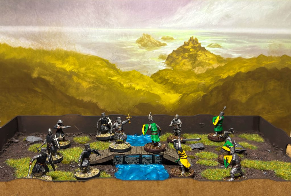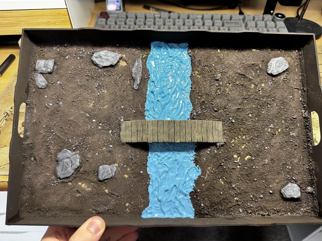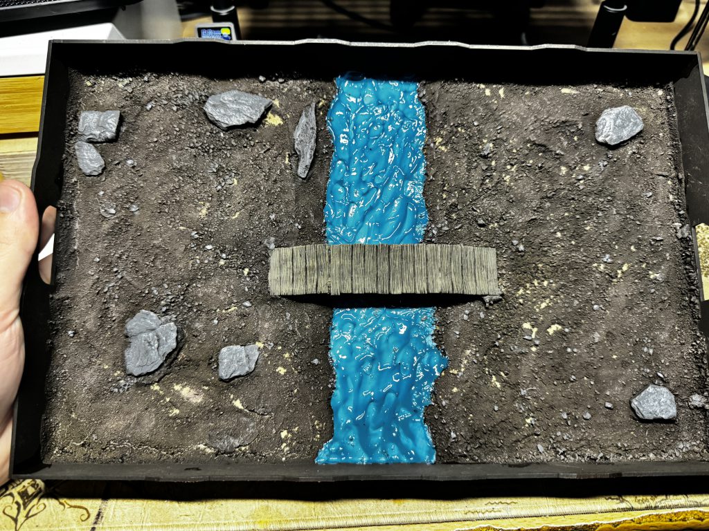I picked up a cheap resin bridge from Alternative Miniatures alongside some nice metal medieval figures specifically for this project, that got glued down with super glue either side of the bank and I was very happy it was the right size for this game; perfect width for one model to cross at a time or to meet an enemy knight on and fight to the death! Or to be pushed off by a coward into the water. After that's down and the paste is all dry, some days later, I sprayed it Hyrax Brown from Colourforge.