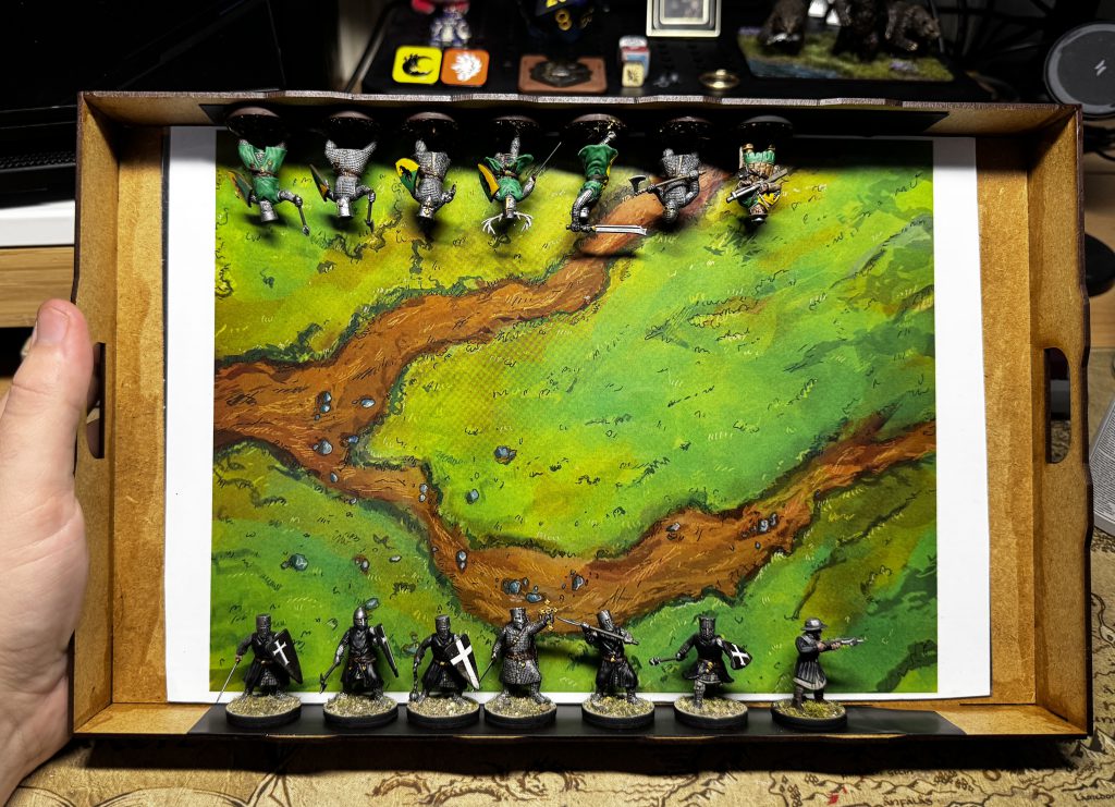 If you're not familiar with it, and are too cowardly to go read the review, GREATHELM is a game of twelve knights (or similar melee-wielding models, it's super minis agnostic) fighting on a simple sheet of paper. That's the whole board size: An A4 or US Letter size sheet of paper. It's one of the reasons I wanted to try it and then was so pleased that it's also very good since it fits on my kitchen table with plenty of extra room. You can also take it out to the pub in a single box playing wargames with your drink of choice in hand.
