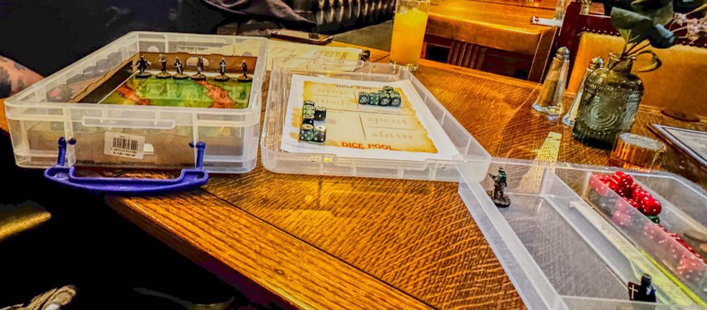 I took this down to the pub for a couple games and drinks with Corrode, teaching him the game, and watching his last-surviving crossbowman surviving