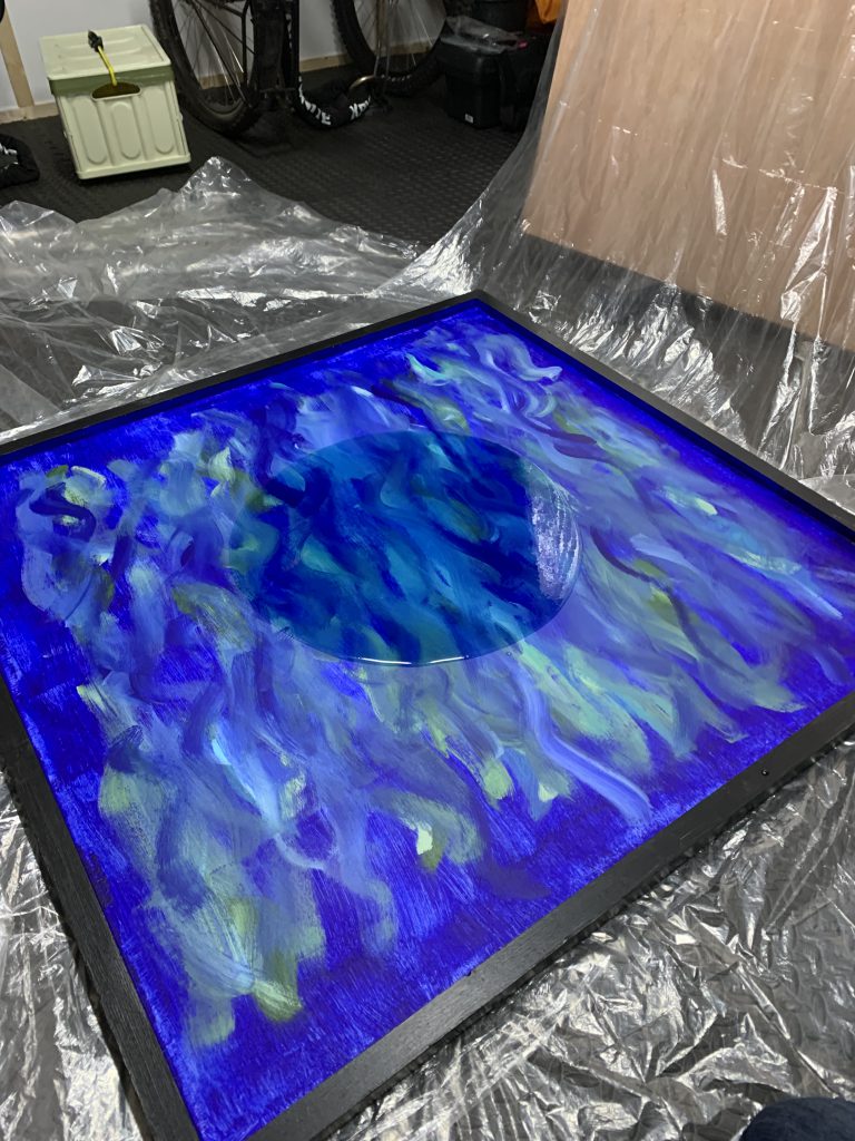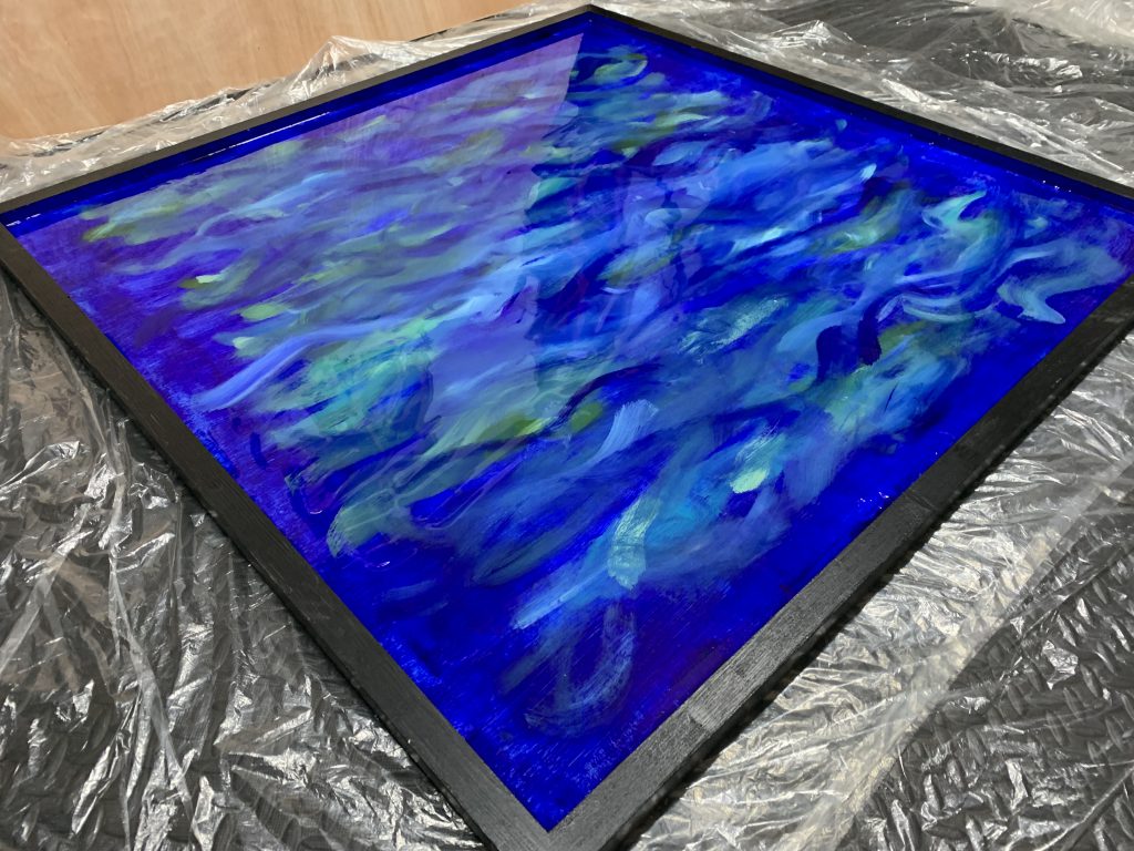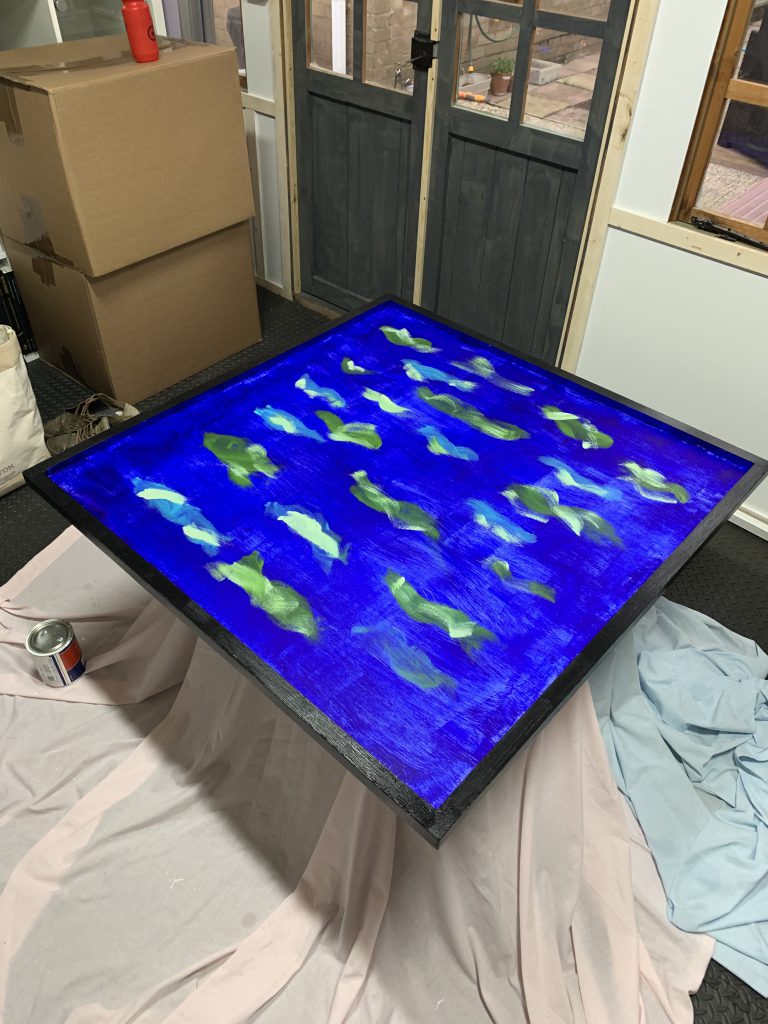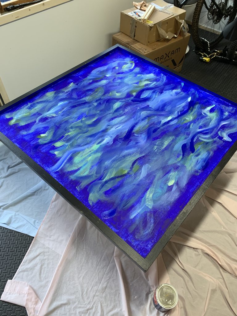 Much like painting a model, the frame would need priming too and once I had a couple of coats of wood primer down I set to work with various blues and greens to create a watery backdrop for the resin. With the backdrop painted I did the border in black, keeping it all relatively the neutral and framing the whole piece.