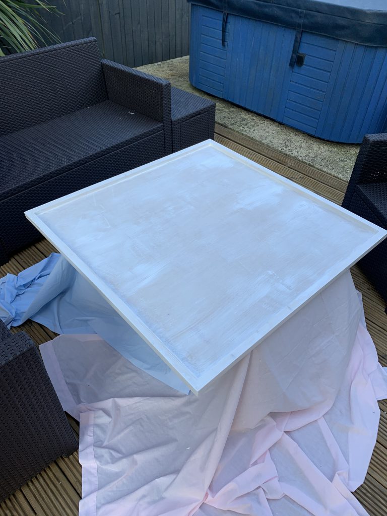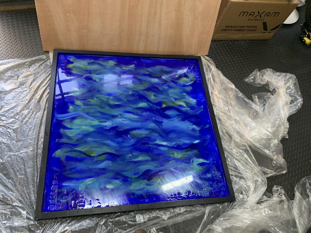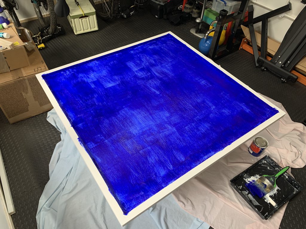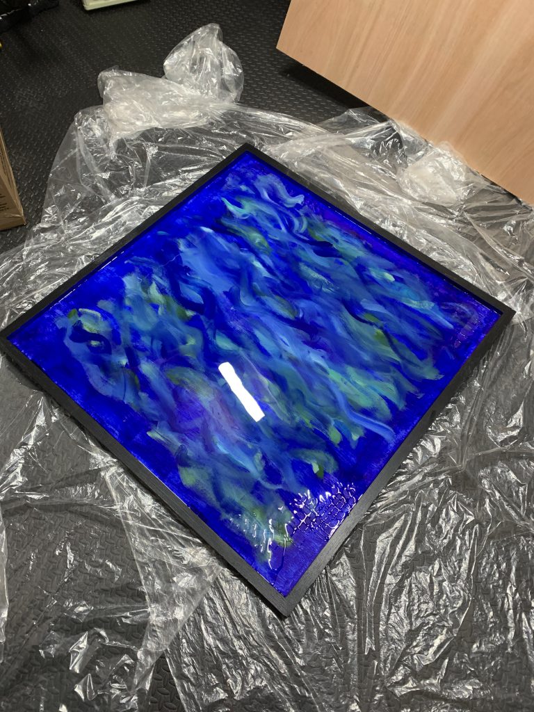 Much like painting a model, the frame would need priming too and once I had a couple of coats of wood primer down I set to work with various blues and greens to create a watery backdrop for the resin. With the backdrop painted I did the border in black, keeping it all relatively the neutral and framing the whole piece.