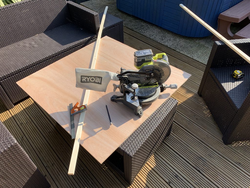 With all of the raw materials together, I went ahead and assembled my frame, making the most of the good weather while I had it. The last time I'd done any real woodworking was secondary school, so I'd be continuing this project as I began and mostly winging it. In a rare moment of foresight, the plywood was cut to size by a professional with the right tools, and I remembered to add the 56mm to each measurement to account for my border.