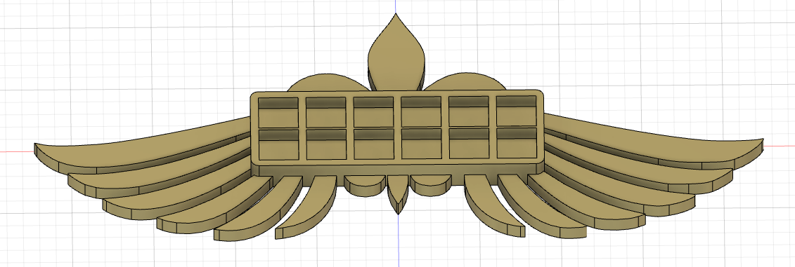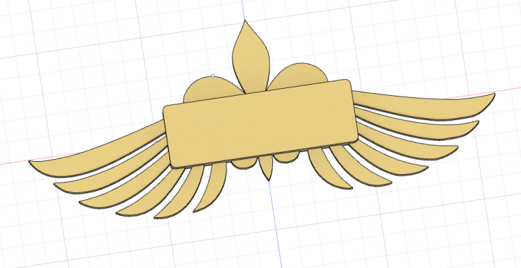 The corners of the dice holder are a bit too sharp for the flowing design of the wings, so the corners get a filet to round them off. Also the centre of the design is too bare, so I import another SVG on the origin layer, this time a Fleur De Lis which also has a strong tie to the Sisters concept. Extruding this to 5mm as well to match the wings, and the design looks much better overall.