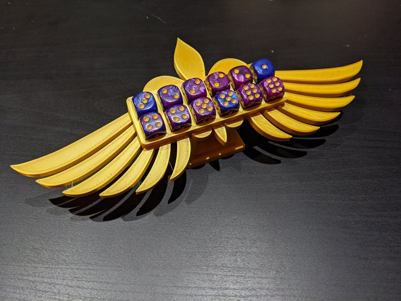 The advantage of layering these two together is the rather long and fragile wings will be anchored in the solid block of the dice holder itself.