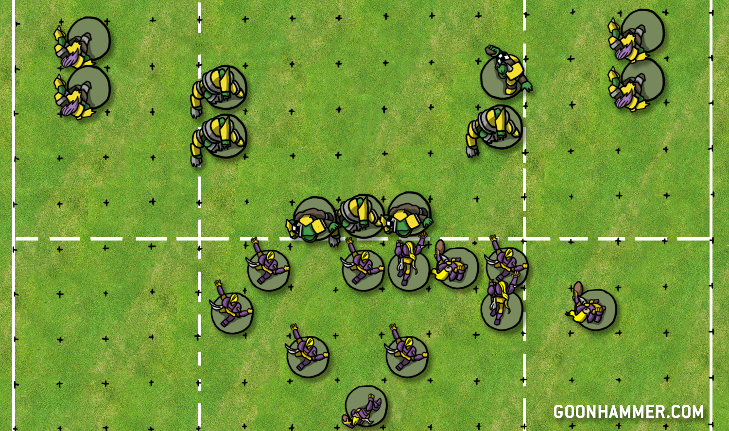 What kind of website would we be if we didn’t have custom-built diagrams to show what we’re talking about? The following example is using an Orc team. It’s set up to cover the whole pitch and specifically funnel the opponent towards the middle of the pitch so that the Orcs’ slower players can remain relevant throughout the drive. Let’s take a look: