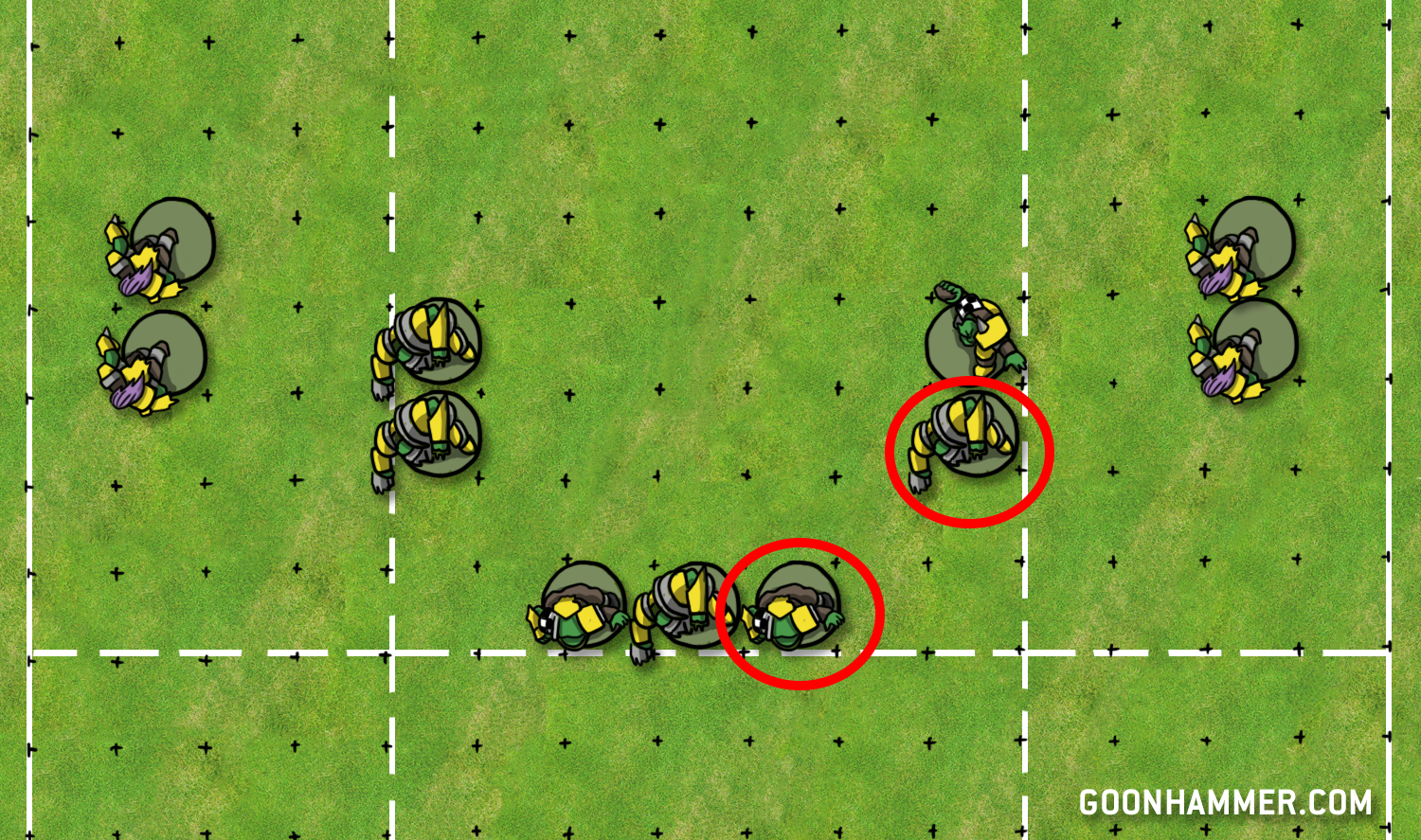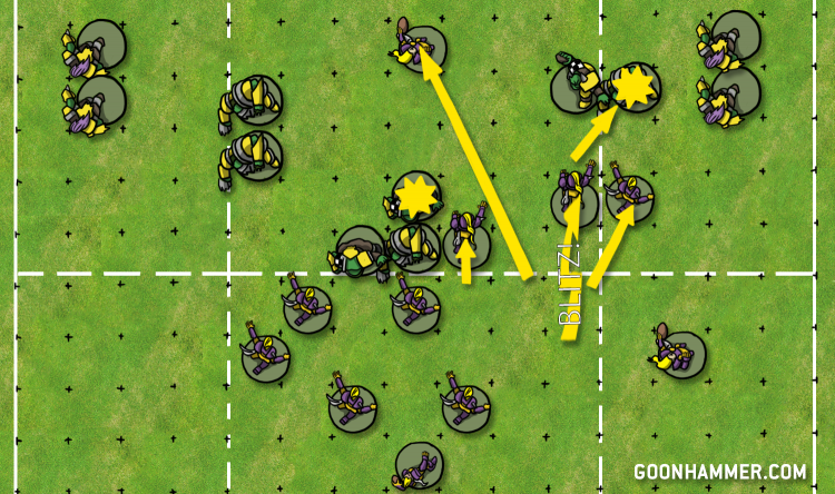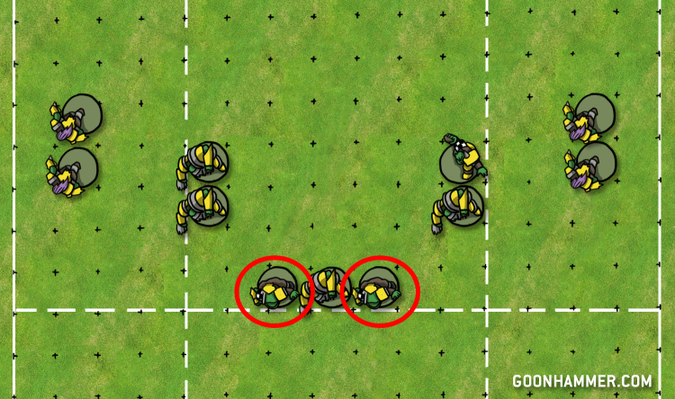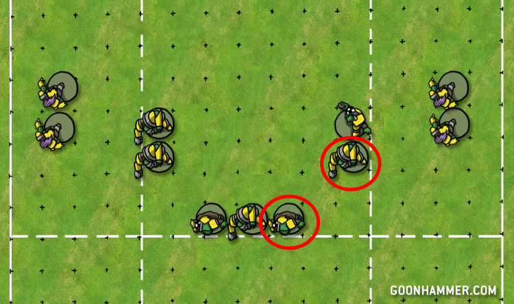 In this example, the linemen are the weakest and least skilled players on the Orc team, making them the obvious point of attack. You may think that an obvious flaw like that is a bad thing, but dear reader, it’s not! One of the Orc team’s biggest weaknesses is their relative slowness, and by exhibiting a weak point in the middle of the pitch it will draw their opponent right down the middle, where there are plenty of S4 Big Uns ready to pummel the opposing team. Orcs on defense play best when they’re shading towards the middle of the pitch, so setting up an opponent’s run up the middle plays directly into the Orc team’s strongest defensive position.