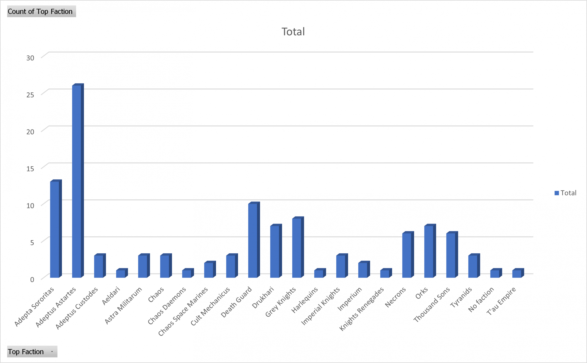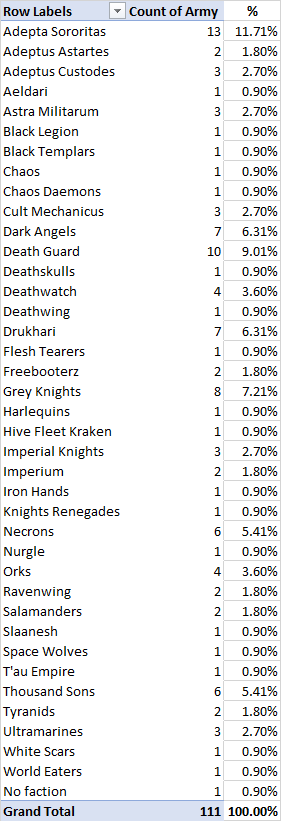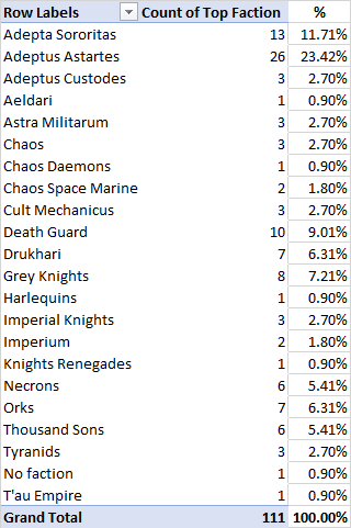 With all the lists in, we have some faction stats for exactly who's making up the field. The first numbers are factions as self-reported in BCP, while the second set are condensed into "top faction" which consolidates stuff like Marine Chapters into "Adeptus Astartes" or CSM Legions into "Chaos Space Marines":