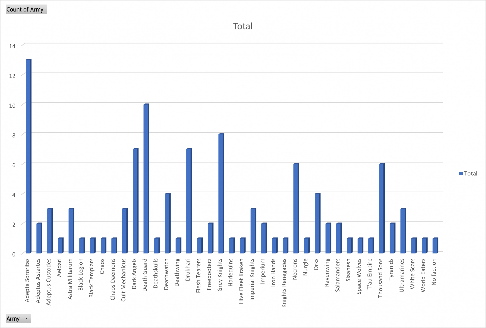 Treating the Marines factions separately, Sororitas are the single most-played faction, with 13 lists - way more popular than they normally are! Right behind them are Dark Angels (including the wings, with a Deathwing and two Ravenwing lists) and Death Guard on 10 lists each.