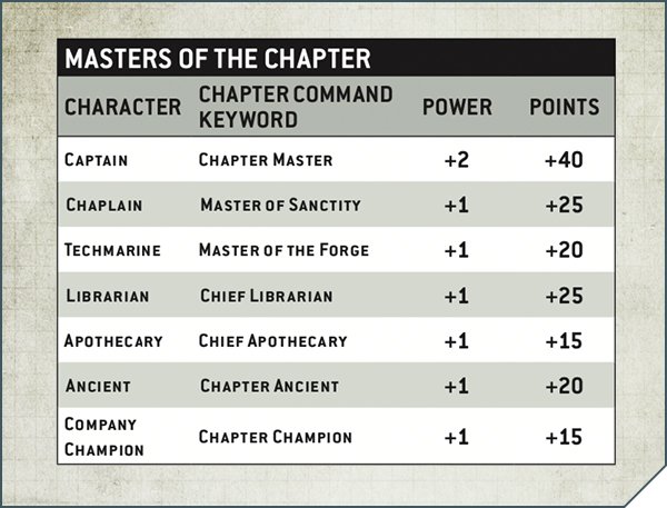This is a whole new section, and there’s lots going on here. Chapter Command represents the top-ranking officers in the Space Marine army, the highest respective person in their role, such as the Chapter Master or Chief Apothecary. These are upgrades to existing units that you'd take, making them more powerful and giving them access to new warlord traits and relics. Rules for these were first introduced in Faith and Fury, but they've been changed significantly here from that first iteration. The biggest change is that the upgrades for your chapter leaders are now paid for with regular-old army building points rather than by using stratagems for CP. They all return here, plus there’s a new section for Chapter Masters to come into their own, with some light restrictions - Deathwatch can’t take Chapter Masters and Blood Angels can’t take Chapter Ancients, since those already exist in different forms in their individual supplements.