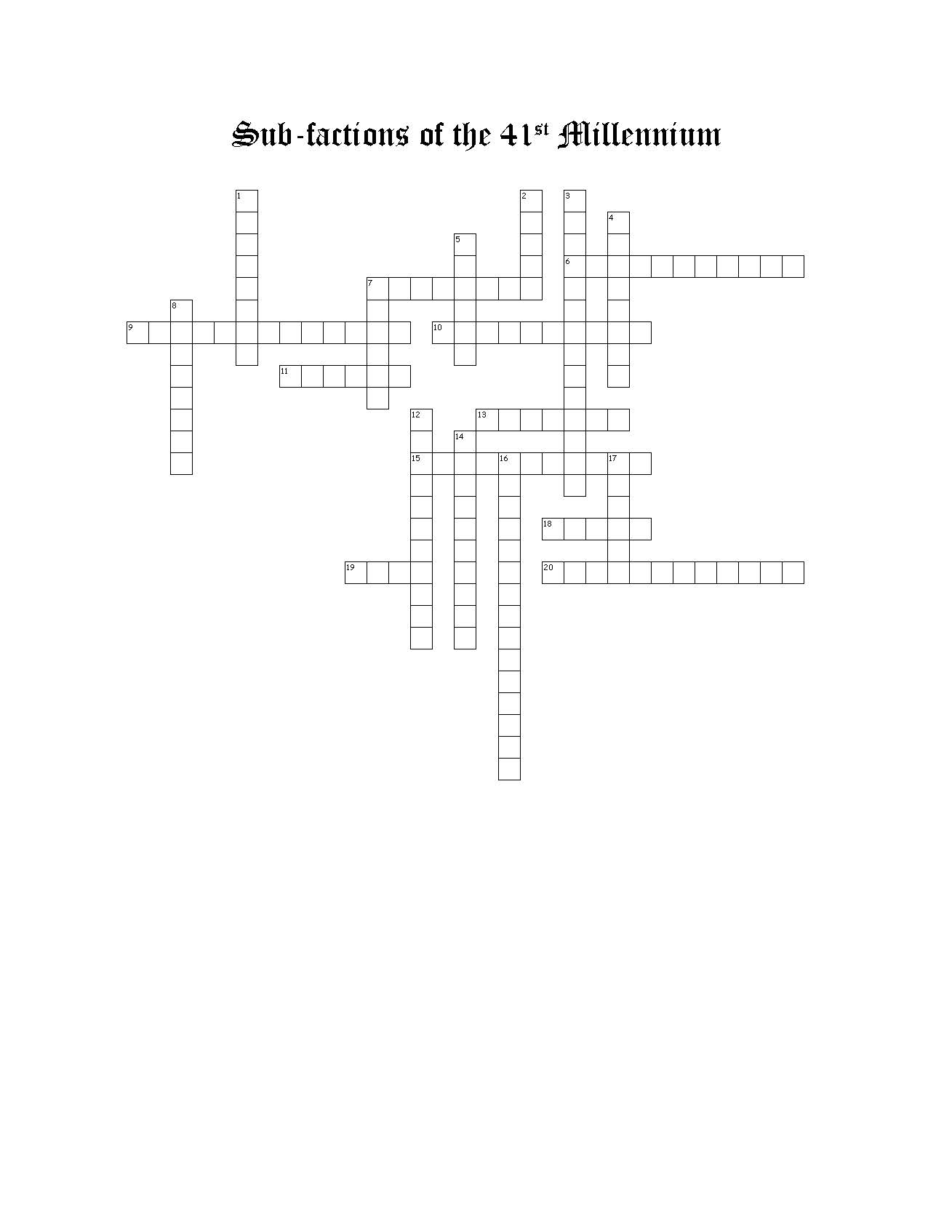 Across 6. Mechanized infantry that hail from an embattled hive world. (2 words) 7. Biggest, shootiest gunz of the lost (2 words) 9. Leaders of a ten thousand year old crusade (2 words) 10. The largest Kabal that can't get enough. (2 words) 11. Famed regiment for not breaking before the planet beneath them did. (1 word) 13. First among the houses. (1 word) 15. Sneaky Blue Gitz (2 words) 18. The most tenacious Forge World that refuses to give up. (1 word) 19. A Forge World that specializes in warfare against Orks. (1 word) 20. A Blood Angels successor chapter infamous for their ferocity & the carnage they leave behind. (2 words) Down 1. A house known for maximum gallantry. (1 word) 2. Bigger, meaner and 'arder than everyone else. (1 word) 3. A Kabal reviled for their expertise in toxins (2 words) 4. A warband dedicated to the worship of Nurgle that becomes deadlier as they are wounded. (2 words) 5. A sept famed for their hot-blooded warriors (1 word) 7. A sept famed for their prototype weapons. (1 word) 8. Some of the toughest jungle fighters in the galaxy. (1 word) 12. A renegade Space Marine Chapter that turned away from the Imperium after a failed secession. (2 words) 14. A house known to respond to any calls for aid. (2 words) 16. An Ultramarines successor noted for their quartered scheme that gets more complex with experience. (2 words) 17. A Forge World that has hollowed out the planet in it's production of material. (1 word)