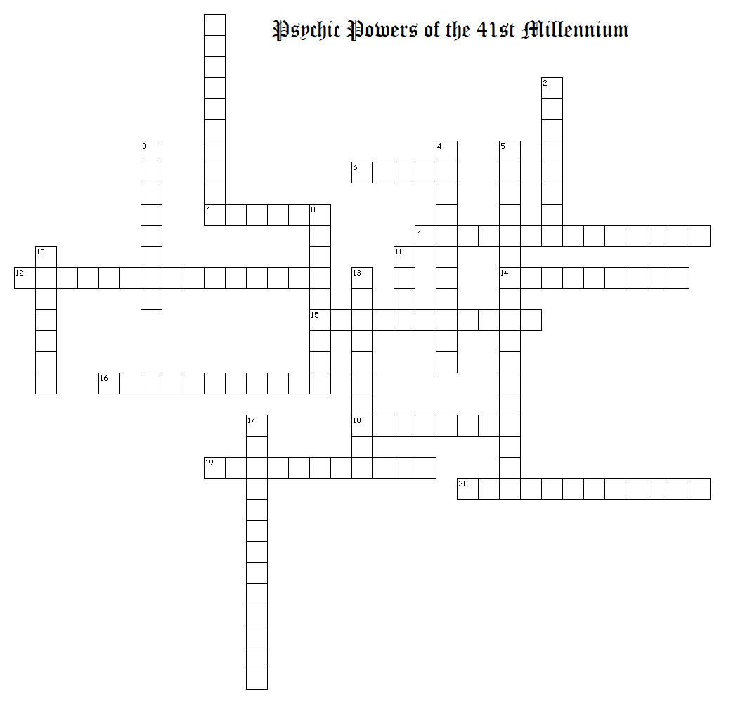 Across 6. This Rune of Fate can help ranged fighters hit their targets (1 word) 7. This psychic ability helps the lads get stuck in across vast distances (2 words) 9. Tzeentch’s favor can be powerful but is also fickle (3 words) 12. Arcs of electricity that jump from unit to unit when cast by a Rune Priest (2 words) 14. This psychic ability instills fear and dread into the hearts of those it touches, enlightening them with the great hunger that comes to consume them all (2 words) 15. Being able to call upon weather in order to shield units on the battlefield (2 words) 16. This psychic ability allows the caster to take over someone’s body completely, even allowing them to open fire on their own comrades (2 words) 18. A negative psychic area that renders the most powerful armor – both physical and mental – useless (2 words) 19. Muddling the minds of their enemies is a way for Troupes to survive longer (3 words) 20. Eyes glow as the victims of this psychic power fall into a trance-like state (2 words) Down 1. Invigorated with a righteous fury, this psychic ability makes these daemon hunters even deadlier in close combat (2 words) 2. This psychic ability targets every nerve and pain receptor in the targets body, rendering them helpless (1 word) 3. Those who worship Tzeentch are often granted powerful abilities, as evident by this strong version of Smite (1 word) 4. This psychic power helps troupes of elegant warriors slip across the battlefield undamaged (3 words) 5. A focused psychic power that cuts through units like a lazerbeam (4 words) 8. Warriors of Titan can engage in a battle of wills with enemy units to cleanse their spirits (2 words) 10. The Aeldari are master psykers and often wage wars unseen on the battlefield, this psychic power is a type of unseen and silent battle between two wills (2 words) 11. This Rune of Fate helps deliver killing blows (1 word) 13. A beam of blood that pierces through multiple units (2 words) 17. Adeptus Astartes can become even more fearsome when bolstered with this psychic ability (3 words)