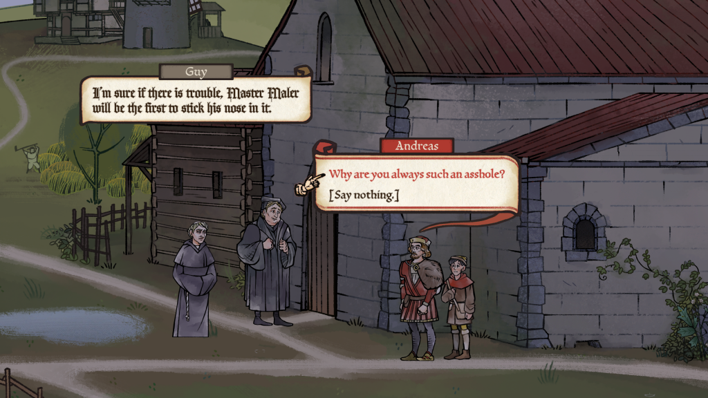 You will feel that change. Time is a fact in Pentiment, and you will age. So will the world around you. Your choices matter! They also kind of don't. That's a strange way to to put it, but when you play the game, you'll understand. It's not about solving the murder. You have to understand that your life isn't about solving the murder. You have to understand that the game is about the people you meet and how you meet them, and if that sounds silly, you haven't yet played a game whose greatest mechanic is about sitting down to dinner.