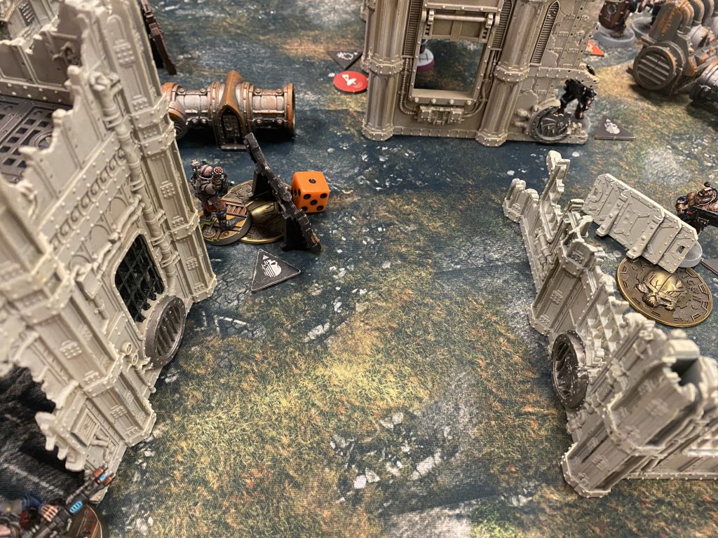 Marc was a very polite and fun opponent. He had brought his two sons with him to Chicago, who also participated in the tournament. This being my sixth Games Workshop Kill Team tournament I've grown pretty accustomed to this mission, and after seeing Marc's deployment and order selection I decided to adopt a strategy similar to one I had used before where I attempt to grab a majority of the objective markers on the first turn to force my opponent to respond to my aggressive action. Additionally, I had chosen Headhunter, Mark for Assassination, and Perfect Ambush as my Tac Ops.