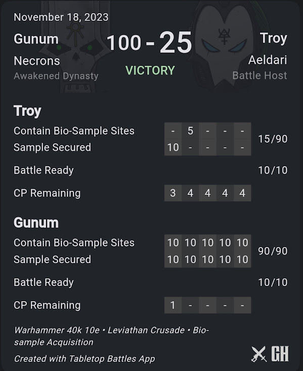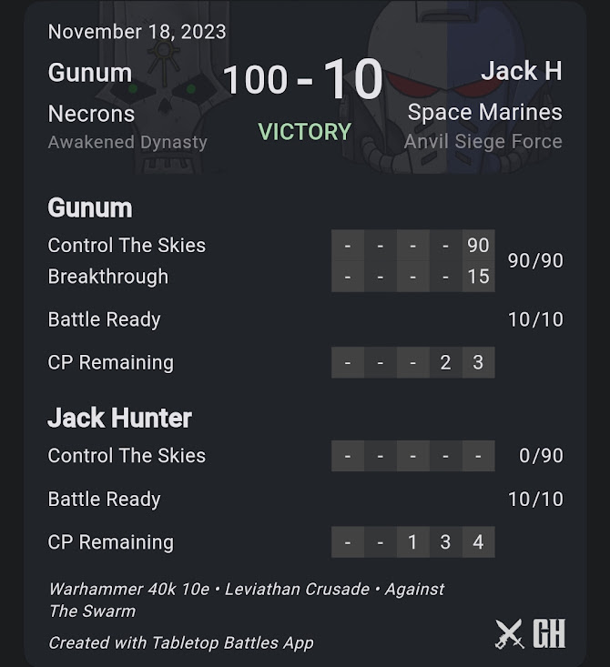As the game drew to a close, my Warriors had grown back to their full size, and Jack was caught in the jaws of Skorpekh from one flank, and my Doomsday Ark shooting from another. At this point, I wandered to the other tables to see how the rest of my team was doing, made sure we hit our goal for Light the Signals, and once I was certain the mission was complete, I looked at Jack at the top of five and said calmly, "You have a Biologis left and a Techmarine. My team has achieved all the goals for this mission, so I won't table you, Jack. You can keep your two characters, and we can save you from having to roll for battle scars."