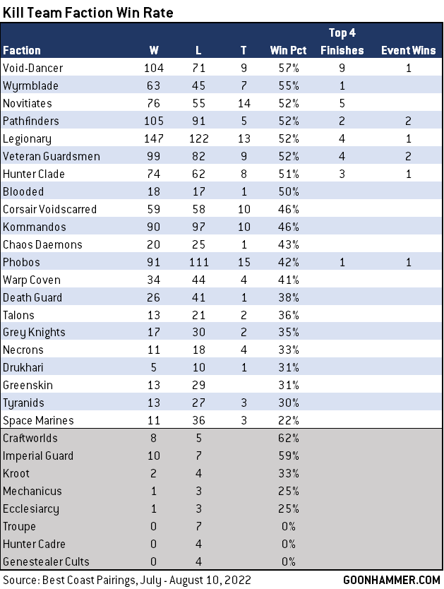 That wraps up our look at the stats. We'll be back tomorrow with a tournament report from GenCon, and then the next time we look at the meta will likely be after the release of Kill Team Dark. I'm personally excited as hell about that one. In the meantime, if you have any questions or feedback, drop us a note in the comments below or email us at