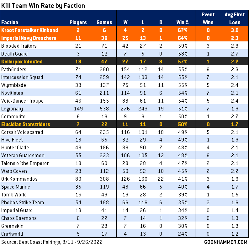 received small buffs in this week's Kill Team Q3 Dataslate update, which should help them compete more. Otherwise the majority of the game's factions appear to be sitting between a 45% and 55% win rate, which is relatively ideal. Hopefully we'll see that band narrow with the changes from the dataslate. Blooded are worth keeping an eye on as well, but it's not yet clear whether that's just a result of small sample sizes.