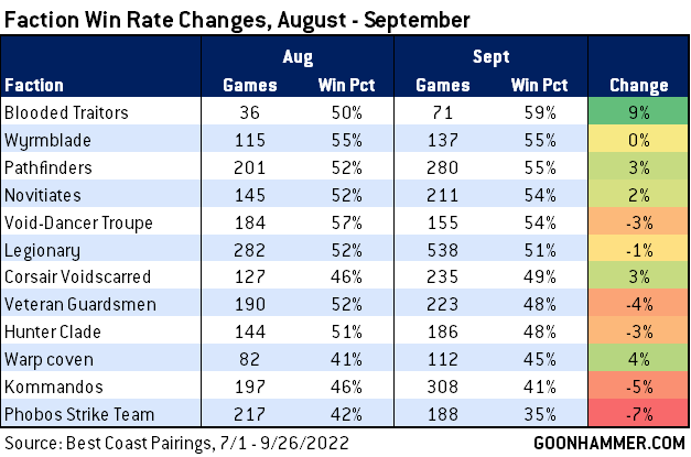 If we compare these results to those in our last update, we can see some important shifts. Blooded got the biggest jump but again, they're going from only 63 games to 71 and represent the smallest faction in our sample of non-Compendium teams. Warp Coven gained some ground and will hopefully gain more with the updated Strategic Ploy, while Phobos Teams lost a lot of steam but will also hopefully make that up, and if they don't well, Intercession Squads are right there to keep Space Marines in the game.