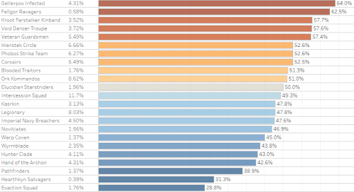 tournaments with 4+ Rounds and 16+ players which ran between April and May, 2023. Doing so shows us three clear winner factions: Farstalker Kinband, Void Dancer Troupe and Gellerpox Infected, with a 55%+ win rate for each. An the opposite end of the spectrum we have Pathfinders and the Exaction squad, with much more dire sub-40% win rates.