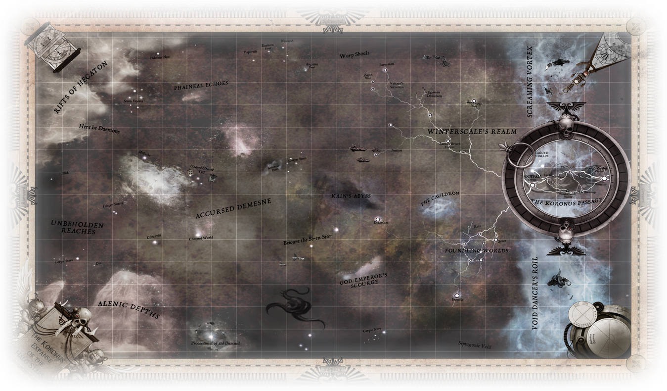 Beyond the Calixis Sector of Segmentum Obscurus, in the furthest reaches of the galactic northwest, lies a wild region of space beneath the light of the Halo Stars known as the Koronus Expanse. Isolated by raging warp storms and accessible to Imperial navigators only through the tumultuous Koronus Passage, the region has long been the sole domain of adventuring rogue traders, xenos empires, and those who seek to escape the reach of the Emperor's light. In the age of the Emperor's Great Crusade, the Koronus Expanse, like the Calixis Sector itself, escaped the embrace of the Imperium and in the millennia since has remained a largely unexplored and little settled edge of the galaxy - it's vast wealth and secret relics safely hidden away.