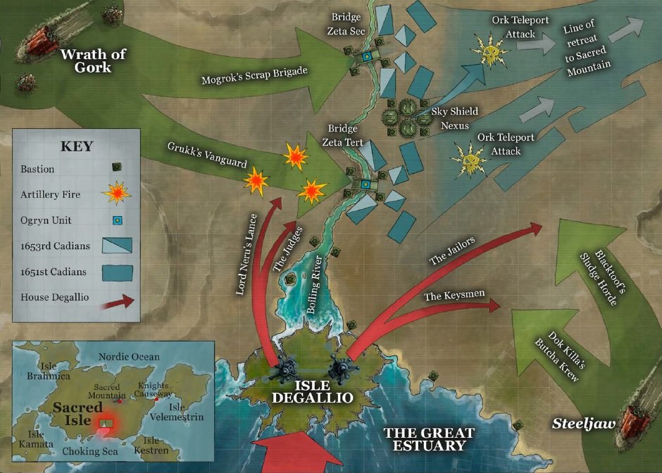 Running south to the Great Estuary of Alaric Prime's largest continent is the Boiling River, a river of toxic, bubbling chemicals that can burn the skin off anyone foolish enough to take a dip. As the Imperial forces fell back, Castellan Stein's plan was now to use the river and its bridge as a bottleneck, slowing the Ork advance while shelling them with artillery to buy time for an ordered withdrawal. This went smoothly at first, and Ork bodies piled up on the riverbanks until the Orks attempted to swim across, dying in the process or being slowed to where they could be easily picked off. Grukk's arrival on the battlefield once again changed things, as he personally smashed through the Ogryns on the bridge while his Weirdboyz teleported units across the river and directly into the Imperial lines. Only timely intervention from the nights of House Degallio saved the day, giving the Cadians and their Militarum Tempestus Regiments time to regroup as the Orks were finally rebuffed.