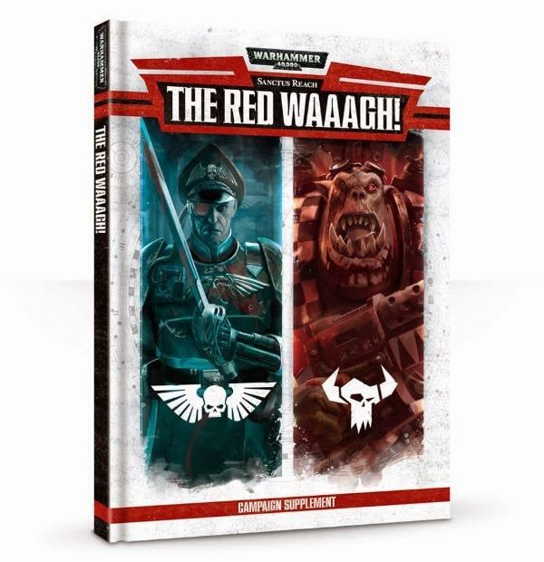 The first of these campaign books was The Red Waaagh!, billed alternatively as the Dawn of the Sanctus Reach campaign. This first part of the campaign deals with the conflict between the Imperial Guard and the orks of Waaagh! Grukk, and this book was released shortly after the introduction of Imperial Knights and Gorka/Morkanauts to the game, so those units are featured prominently in the story and rules. On top of new rules for Formations, Red Waaagh! has the entire story of the campaign and ten missions which allow players to tell its story through the campaign's major battles. These missions also served as the reintroduction point for Planetstrike missions to the game, laying out rules where one player takes the role of attacker, dropping their units in from the sky onto the defender's fortified positions.
