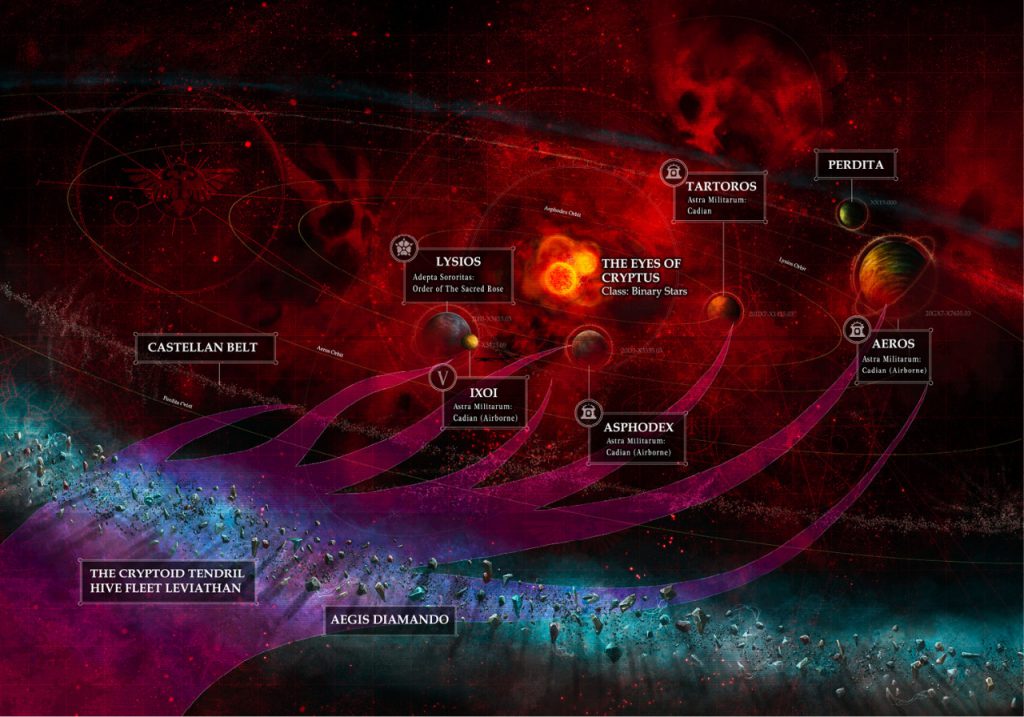 The worlds of the Cryptus System had ample warning of the approaching hive fleets. As the tendril wound closer, communications in the region began to break down and become unreliable. In those early days, the hope was that the hive fleet would freeze in the Aegis Diamondo and shattered into stardust but the barrier was a double-edged sword: With the Hive fleet obscuring the light of the Astronomicon, Imperial Ships and Navigators would be unable to translate into the system inside the barrier. The Aegis would trap the defenders in - they were on their own.