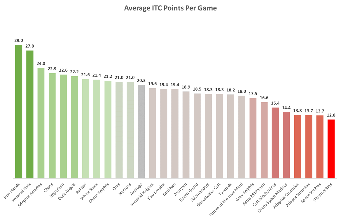 no Iron Hands player ever finished in the bottom third of the rankings. That should stun you. Either the Iron Hands players are collectively some of the best players in the ITC or the army is so forgiving that just about any person can pick them up and outperform everyone else. If we dig a bit, our friends at 40kstats.com show that Drukhari lead the VP scoring category at 24.47 and hold the largest positive spread at ~2. However, the Tau actually lead in Points Against (>200 games) with 21.88. By comparison the Iron Hands average 28.2 points for and only gave up 19.8. That's an incredible points advantage with a differential ~4 times greater than the next best at 8.4 points. Essentially what this says is that when Iron Hands win, they win big. And when Iron Hands lose, they lose very narrowly. It's hard to impress just how far outside the norm these numbers are - they are truly unseen in 8th edition. Not Castellans, not Ynnari, not anything.
